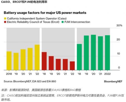 电池利用率受电池使用情况影响,也因地区而异。对于加利福尼亚州独立系统运营商(CAISO),由于市场多元化的商业模式,利用率波动很大;而在德克萨斯州,对于电力可靠性委员会(ERCOT),电池主要提供调频服务,因此电池平均利用率较低;在PJM互联市场中,电池也主要用于调频,但由于市场对电池的循环需求高,利用率往往相当之高。