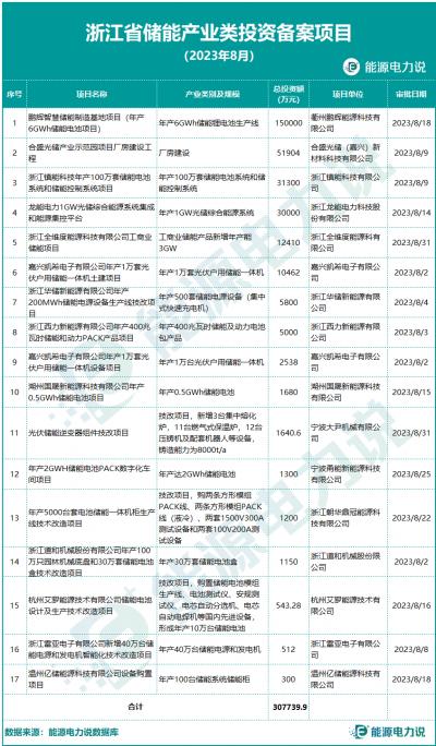 8月浙江备案产业类储能项目18个,总投资金额超30亿元,涉及储能产业领域包括储能电池、储能系统、储能PCS、电池包、光伏户用储能一体机、工商业储能产品、储能一体机柜等生产线建设及技改项目。其中包括其中包括投资15亿元的年产6GWh鹏辉智慧储能制造基地项目、浙江镇能科技年产100万套储能电池系统和储能控制系统项目、龙能电力1GW光储综合能源系统集成和能源集控平台项目等。