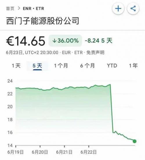 在发布撤回2023财年的利润前景预期公告次日,西门子能源股价跌去37%,市值蒸发超500亿元。