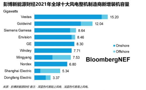 彭博新能源财经发布的数据显示,2022年全球风电整机商排名中,西门子歌美飒和中国企业明阳智能并列全球第五,装机容量均为6.8 GW。