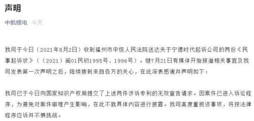 中航锂电2日发布声明称,公司于今日(2021年8月2日)收到福州市中级人民法院送达关于宁德时代起诉公司的两份《民事起诉状》((2021)闽01民初1995号、1996号)。