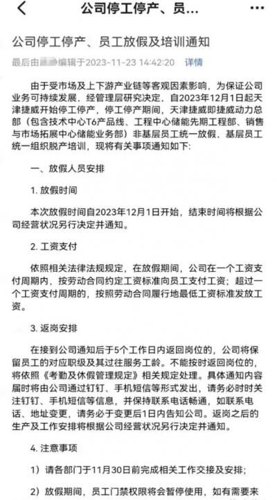 近期,一则令人大跌眼镜的消息在业界传开——天津市捷威动力工业有限公司发布了《公司停工停产、员工放假及培训通知》,明确表示天津工厂自2023年12月1日起进入停工停产阶段。这一决定无疑给业界带来了不小的震动。