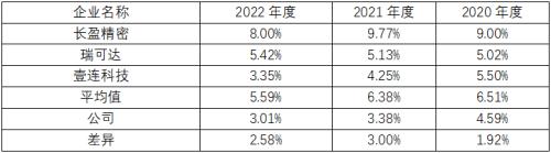 公司研发费用率大幅低于同行业平均水平,而且压线通过高新技术企业研发费用率最低标准,说明公司对于新产品研发不够重视,在未来与同行业的竞争中,会逐步显现并被淘汰,壹连科技报告期毛利率分别高于公司0.91个百分点、0.87个百分点和0.34个百分点,而同期壹连科技毛利率高于公司13.62个百分点、7.46个百分点和6.98个百分点就充分说明,研发费用率高的企业其产品溢价率更高,更具有竞争力。