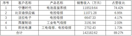 公司电池连接系统产品的客户主要是宁德时代,报告期内,公司对宁德时代电池连接系统产品的收入分别为7,324.51万元、56,729.56万元和118,517.68万元,占电池连接系统产品收入的比例分别为75.12%、96.32%、97.13%。占比逐期增加。