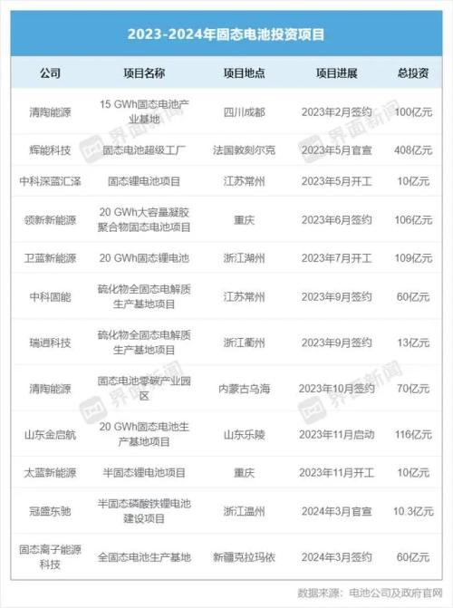 根据界面新闻的不完全统计,自2023年以来,国内半固态和全固态电池项目累计超过11个,总投资额达到664.3亿元。这还不包括中国台湾企业辉能科技计划在法国新建的固态电池工厂,该项目投资额预计超过400亿元。