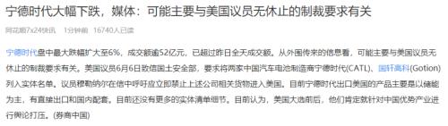 6月7日,宁德时代低开跳水,盘中一度重挫逾8%,市值蒸发700多亿元,以一己之力带崩创业板。