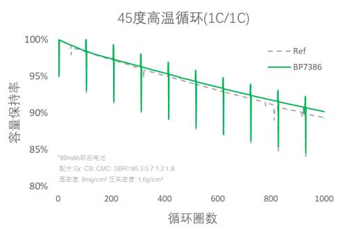 电池的稳定循环寿命对用户体验至关重要。作为电极的关键材料,粘结剂的性能直接影响电池的循环寿命。Basonal® Power 7386通过优化剥离强度,使电极结构更加稳定,从而显著提高了电池的循环寿命。高温循环测试显示,该粘结剂使电池在1000次循环后仍能保持90%以上的容量,表现出卓越的稳定性和长寿命。