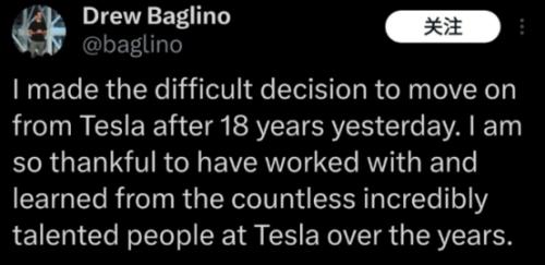 其次便是在裁员前夕,特斯拉高级副总裁Drew Baglino确认离职,并在社交平台上表示:“昨天我做出了一个艰难的决定,离开效力18年的特斯拉。”