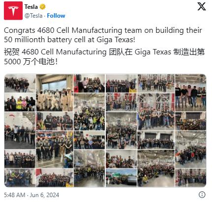 到了今年6月6日,特斯拉宣布其得克萨斯州的超级工厂已经生产了5000万枚4680电芯,通过简单的计算可得知,特斯拉在8个月的时间生产了3000万颗电芯,平均两个多月就能生产1000万颗电芯,产能已经在大幅提升。