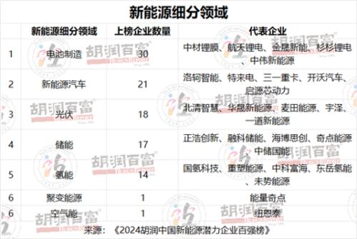 胡润百富董事长兼首席调研官胡润表示,电池制造领域上榜潜力企业最多,有30家。新能源汽车领域有21家潜力企业上榜,包括电动汽车和电动两轮车。氢能源领域上榜潜力企业有14家。现在的氢能就像5-10年前的锂电池和光伏,技术进步大、商用进展快,正迎来重大发展机遇。