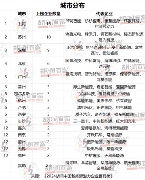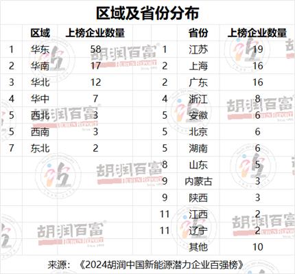 7月26日,《2024胡润中国新能源潜力企业百强榜》发布。该榜单列出成立于2000年之后,企业价值在10亿元至150亿元人民币之间,中国新能源领域最具发展潜力的非上市企业,按照企业估值进行排名。江苏成为上榜潜力企业最多的省份,有19家企业上榜。