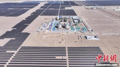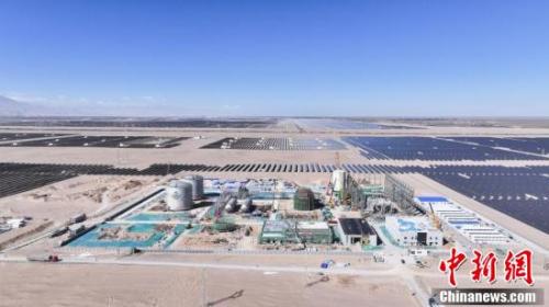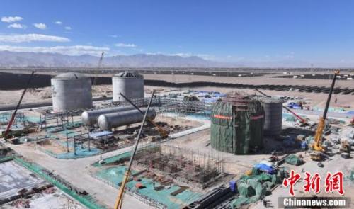 9月28日,在青海省海西蒙古族藏族自治州格尔木市,世界最大规模液态空气储能项目正在紧张施工中,目前,该项目主体工程已完成70%,正处于机械安装期,预计年底全部建成投产。据了解,该新型储能项目建设规模为60MW/600MWh,并配建25万千瓦光伏,该项目采用新一代的液态压缩空气储能技术,将电能以常压、低温、高密度的液化空气形式存储,投产后将成为液态空气储能领域发电功率世界第一、储能规模世界最大的示范项目。图为航拍世界最大规模液态空气储能项目施工现场。(无人机照片)