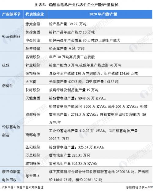 目前,我国铅酸蓄电池产业链中生产实力强劲的企业包括天能集团、骆驼股份、南都电源、超威动力、双登集团、圣阳股份、风帆有限、理士电池等。