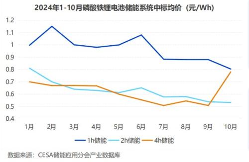 来自CESA储能应用分会的统计,10月,1h和2h磷酸铁锂系统报价均创新低。其中,1h系统中标单价在0.79-0.85元/Wh区间内,加权均价0.804元/Wh,环比下降8.65%。