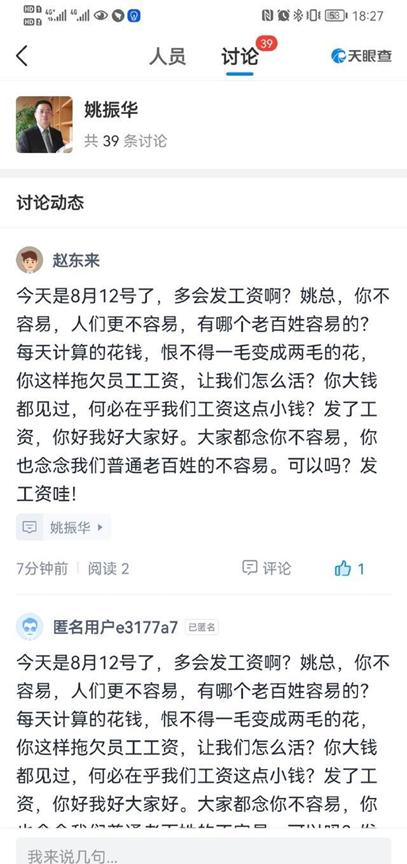 据了解,时至8月12日,还有很多员工通过“天眼查”APP向宝能集团董事长姚振华直接反映欠薪问题。其中有员工表示:“今天8月12号了,什么时候发工资?姚总,你不容易,员工更不容易,每天计算着花钱,恨不得一毛钱当两毛钱花。你这样拖欠工资,让我们怎么活?你大钱都见过,何必在乎我们工资这点小钱?大家都念你不容易,你也念念我们老百姓的不容易可以吗?”