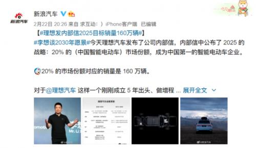 现有资料显示,理想汽车将基于第二代增程电动X平台和侧重于大空间的纯电平台Whale(鲸鱼)、以及追求高性能的纯电平台Shark (鲨鱼),不断满足品牌豪华智能车的定位以及家庭用车需求。计划从2022年开始每年将发布两款产品,并在2023年开始交付首款纯电车型,实现15-50万元细分市场覆盖。按照2025年的战略目标,理想汽车将在2025年获取中国智能电动车市场20%市场份额,凭借160辆的年销量成为中国第一的智能电动车企业。