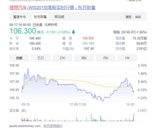 按照常理,销量快速增长本该是车企十分高兴的事,也应该是关注该车企的社会资本高兴的事。但让人意外的是,理想汽车的销量上涨却并没有在资本市场得到正面反馈。从近期的股价表现来看,理想汽车在港股上市首日便跌破了发行价格。截至8月17日封盘,理想汽车的股价为106.3港元,明显低于118港元的发行价,市值下跌238.18亿港元。
