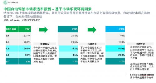 可以肯定的是,汽车智能化是趋势,而自动驾驶会成为智能汽车的标配。8月16日,咨询机构IHS Markit(埃信华迈)发布了《中国自动驾驶市场与未来出行市场展望》,报告预测,2025年自动驾驶L2以上的新车渗透率至少达到45%,2030年将突破80%。