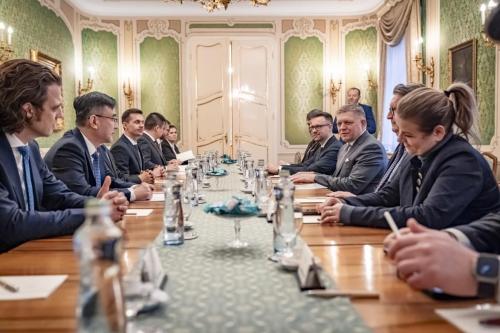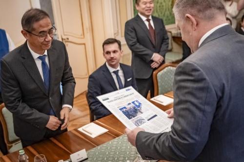 26日下午2点,斯洛伐克政府办公室内,菲佐总理首先对国轩高科和InoBat的代表团成员表示了热烈欢迎。蔡毅特别展示了人民日报海外版关于菲佐总理于2024年11月参访国轩的报道。菲佐总理对此表现出浓厚的兴趣,并幽默地表示:"看来我需要开始学习中文了,以便更好地了解中国的发展和与中国的合作。"