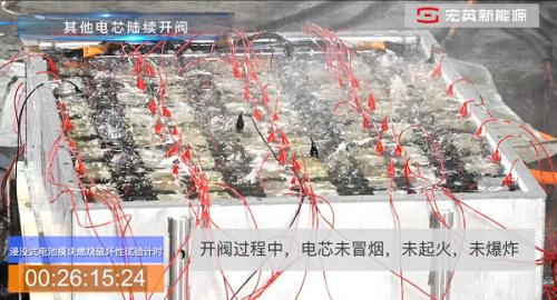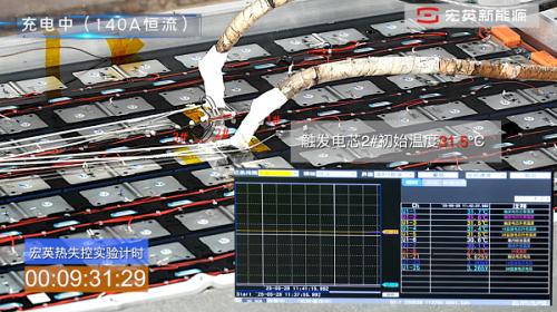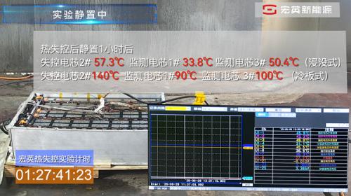宏英新能源针对浸没式液冷PACK电池包,模拟单体电芯热失控场景,测试其阻止热扩散的能力。