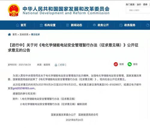 为深入贯彻中央领导同志关于电化学储能电站安全管理指示批示精神,加强电化学储能电站安全管理,国家发展改革委、国家能源局组织起草了《电化学储能电站安全管理暂行办法(征求意见稿)》,现向社会公开征求意见。