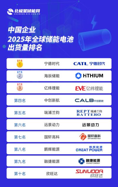 据北极星储能网统计,2025年中国储能电池企业在全球市场出货量已突破650GWh,较2024年同比增长近100%。从市场竞争格局来看,前10名企业的合计市占率超80%,主要得益于这些企业在技术研发、产能规模、供应链整合等方面的综合优势。