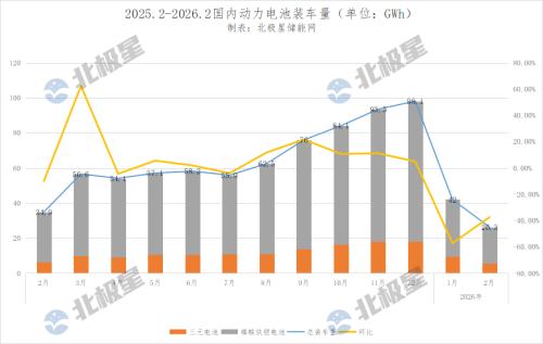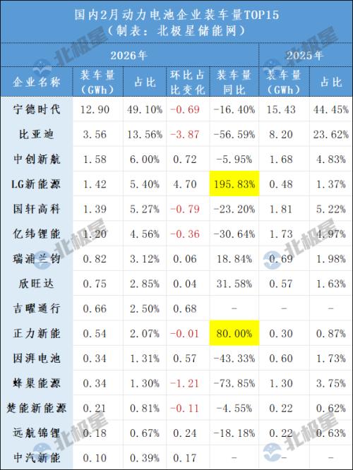 北极星储能网获悉,3月12日,中国汽车动力电池产业创新联盟发布2026年2月动力和储能电池月度信息,包括2月份动力和储能的产量以及销量数据,还有动力电池的装车量数据。同时公布了动力电池装车量的企业排名TOP15。