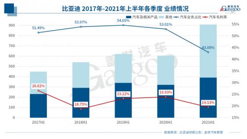 以上,仅仅是比亚迪整车相关业务的规划预期,要知道的是,伴随比亚迪手机部件及组装业务的壮大及二次充电电池及光伏业务的兴起,上半年间三大业务占本集团总收入的比例分别为43.08%、47.46%和9.12%,整车相关业务营收占比首次跌破50%,甚至低于手机部件相关业务。