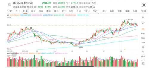 继2020年下半年以来比亚迪股价持续走高的态势后,今年以来该股股价波动幅度放大,在今年5月份触及140.82元/股的阶段性低点后,一路震荡上行,并于8月6日创造317.30元/股的历史新高,当前市值已稳超8000亿元。