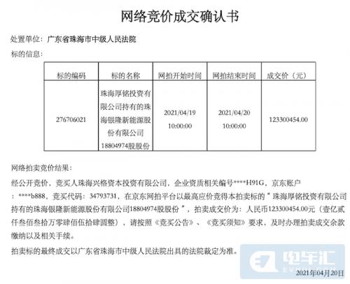 到了今年,格力电器及背后的格力集团对银隆的动作多了起来。从京东司法拍卖网站查询到,今年4月20日,珠海兴格资本投资有限公司以1.2亿元的价格拍得了厚铭投资持有的银隆部分股权,而兴格资本则是格力集团的全资子公司。此次格力电器拍得股权主要是的银隆投资及厚铭投资持有的,而这两家公司则分别是魏银仓和孙国华实际控制的,至此,董明珠通过格力电器彻底扫清了银隆股权上的纠纷。