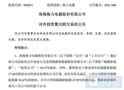 今日,格力电器发布公告称,公司通过参与司法拍卖公开竞拍方式,以18.28亿元的价格竞得银隆新能源3.36亿股股份,由于董明珠将其持有的银隆新能源1.93亿股股份对应的表决权委托公司行使。此次交易完成后,公司将合计控制银隆新能源5.29亿股股份对应的表决权,占银隆新能源总股本的47.93%,银隆新能源将成为上市公司的控股子公司。