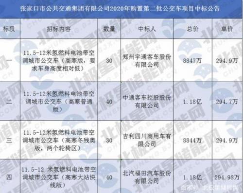 中国储能网讯:12月14日,张家口市公共交通集团有限公司公布了2020年购置第二批公交车项目中标公告,四个标段共计140辆氢燃料电池公交车,郑州宇通、中通、吉利四川商用车、北汽福田分别获得中标,中标总价4.13亿元。