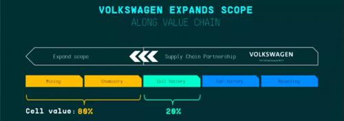 大众降低(成本)的环节和特斯拉一模一样,从电池设计,从材料,从生产工艺,大众在国内和国外的产能扩张,跟宁德都非常接近。大众收购国轩股权,包括在其他国家建厂,其目标是希望在2025年,其在全球的动力电池产能能做到100gwh。