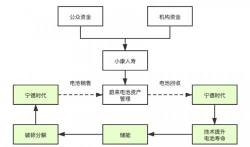 2020年8月18日,由蔚来(采购方)、宁德时代(生产商和技术提供商)、国泰君安(资产管理方)和湖北省科技投资(政策)共同投资成立蔚能电池资产有限公司,注册资本8亿,各占25%。随后完成了A轮融资,估值达到25亿。