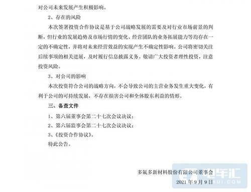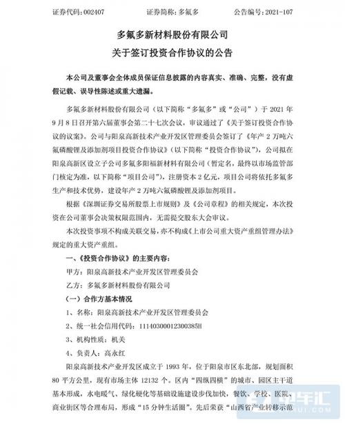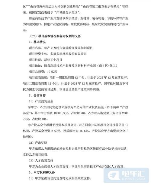 电车汇消息:9月8日,多氟多发布公告称,公司与阳泉高新技术产业开发区管理委员会签订投资合作协议,公司拟在阳泉高新区设立子公司多氟多阳福新材料有限公司,注册资本2亿元,该项目公司将依托多氟多生产和技术优势,建设年产2万吨六氟磷酸锂及添加剂项目。项目总投资10亿元,其中,项目一期建设周期12个月,计划于2022年12月底前投产。