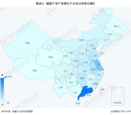 从我国储能行业产业链企业区域分布来看,储能行业产业链企业主要分布在广东地区,其次是江苏地区;同时中部地区陕西、湖南、安徽、河北等省份也有储能企业分布。