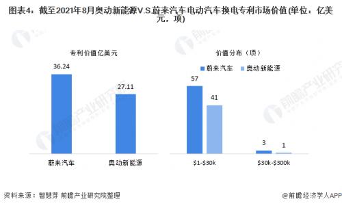 从换电专利价值来看,蔚来汽车电动汽车换电专利总价值高于奥动新能源,蔚来汽车电动汽车换电专利总价值为36.24亿美元,奥动新能源为27.11亿美元。在专利价值分布方面,两者大多数电动汽车换电专利价值主要集中在1万-3万美元。