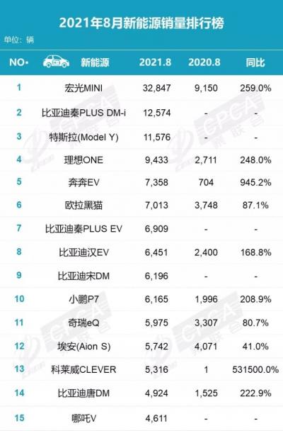 在排名前15的车型中,宏光MINI依旧一马当先,第2还是比亚迪秦PLUS DM-i,特斯拉Model Y排名第3,理想ONE依旧排名第4,奔奔EV排名第5。前5名之外,欧拉黑猫、比亚迪秦PLUS EV、比亚迪汉EV、比亚迪宋DM、小鹏P7依次上榜。不难看出,国内新能源汽车市场由中国品牌主导,特斯拉Model3直接跌出了整个榜单,比亚迪依旧是8月国内新能源汽车市场最大的赢家,下月销量再创新高可能是“板上钉钉”了。