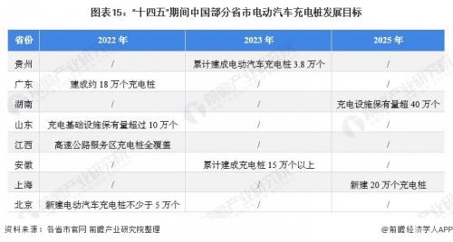 “十四五”期间,我国部分省份提出了电动汽车充电桩建设的发展目标。其中,广东、山东和北京提出了至2022年的充电桩建设数量目标,江西提出要实现高速公路服务区充电桩全覆盖;贵州和安徽对2023年的累计充电桩数量做出了规划。此外,湖南计划到2025年充电设施保有量超40万个,而上海的目标是到2025年底新建20万个充电桩。