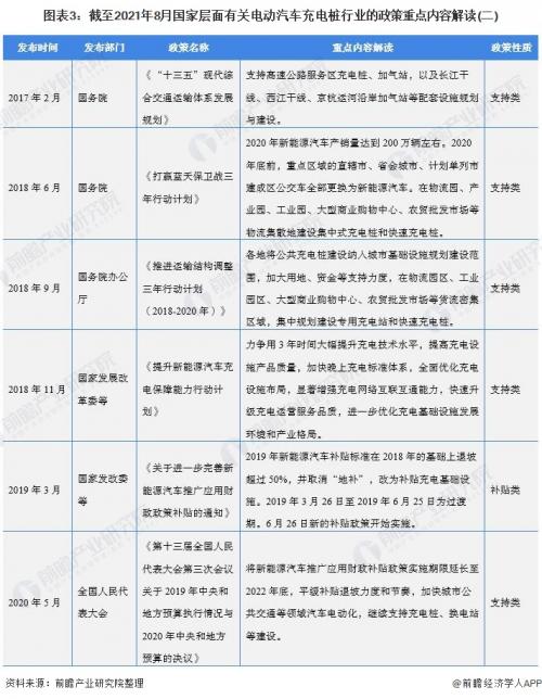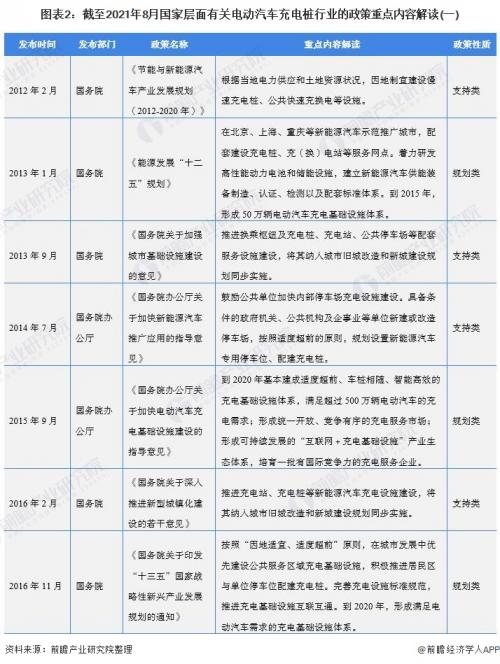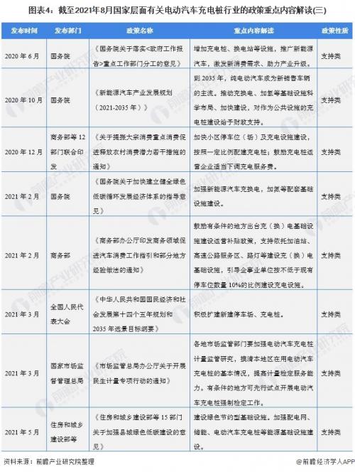 2012年以来,我国各部委积极出台相关政策促进充电桩在各领域的建设,促进充电桩行业的发展。政策的支持与引导能够很大程度上提高充电桩的建设进程和运营效率。截止2021年8月底,中国电动汽车充电桩国家层面相关政策汇总如下: