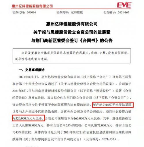9月22日,亿纬锂能发布公告称,公司拟与上海恩捷在荆门高新区共同设立合资公司并由合资公司投资建设高性能锂电池隔膜项目事宜签署《合同书》。该项目总投资约52亿元,将建设16条锂电池隔膜生产线。