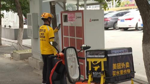外卖骑手丁鸿志:我们会在App上查找最近的换电柜,到这来之后把缺电的电池放到柜里,在20到30秒之间,就能弹出来一块满电的电池,整个换电过程不足一分钟,一天得换五次左右。至少它解决了我在固定点更换电池的时间,甚至来讲我们以前用的电池都是比较沉重的,换电减轻了一些重量给我们带来更多便捷。我要是用这个换电服务需要支付199元一个月,全城随便换,换电费用都是由我们自己承担。