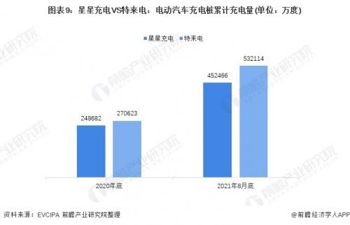 从电动汽车充电桩运营商累计充电量来看,截至2021年8月底,星星充电和特来电的累计充电量均较2020年底实现了大幅增长,星星充电的累计充电量为45.25亿度,特来电的累计充电量为53.21亿度。特来电充电桩充电量保持领先,且与星星充电间逐渐拉开差距。