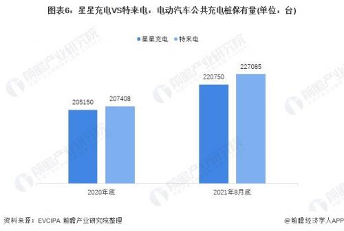 从电动汽车公共充电桩的保有量来看,2020年年底至2021年8月底,八个月期间,星星充电的电动汽车公共充电桩保有量由20.52万台增长至22.08万台,增长幅度为7.6%;特来电的电动汽车公共充电桩数量由20.74万台增长至22.71万台,增幅为9.49%。整体来看,特来电的电动汽车公共充电桩保有量多于星星充电,且增幅更大。