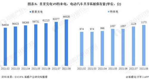 从电动汽车共享私桩的运营数量来看,2021年2月-8月,星星充电和特来电的共享私桩运营保有数量均呈现上涨趋势。但就绝对数量而言,星星充电遥遥领先于特来电,截至2021年8月底,星星充电的共享私桩数量达到6.65万台,而特来电的共享私桩数量仅有1173台。