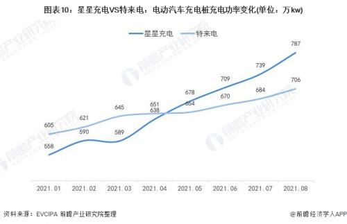 从电动汽车充电桩充电功率来看,2021年1-8月,星星充电和特来电的充电桩充电功率均呈现上升趋势,但星星充电提升速度较快,在5月份反超特来电后保持领先。