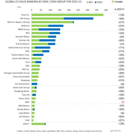 根据EV Sales官网网的数据显示,2021年上半年,全球新能源汽车销量达到了265万辆,同比增长达到了168%。新能源汽车占据全球汽车市场份额由3%增长到了6.3%。