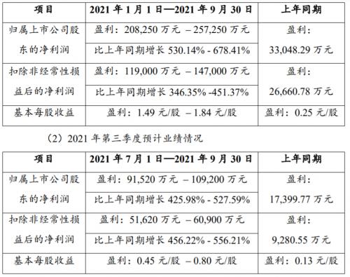 赣锋锂业前三季度业绩预告显示,表示前三季度实现归属上市公司股东的净利润预计为20.83亿元-25.73亿元,同比增长530.14%-678.41%。第三季度归属上市公司股东的净利润预计为9.15亿元C10.92亿元,同比增长425.98%-527.59%。
