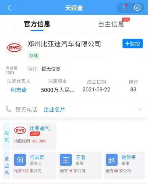 10月9日消息,郑州比亚迪汽车有限公司以7.27亿元的高价竞得郑州4宗约4104亩工业用地,将在郑州成立一个比亚迪的子公司,法人为何志奇,注册资本5000万人民币,经营范围很广,包括汽车配件及零件部位、新能源汽车电附件销售和新能源整车销售等。