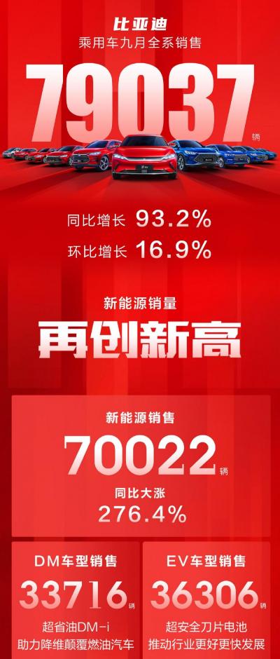 今年中国新能源汽车产业高速发展,以一种大家都想不到的速度在强势增长。而作为一个老品牌汽车商,比亚迪在新能源领域的发展成绩是很可观的。就今年来说,官方数据显示,九月,比亚迪乘用车全系销售共79037辆,其中新能源乘用车销量为70022辆,同比增长276.4%,三季度累计销量超过了20万。